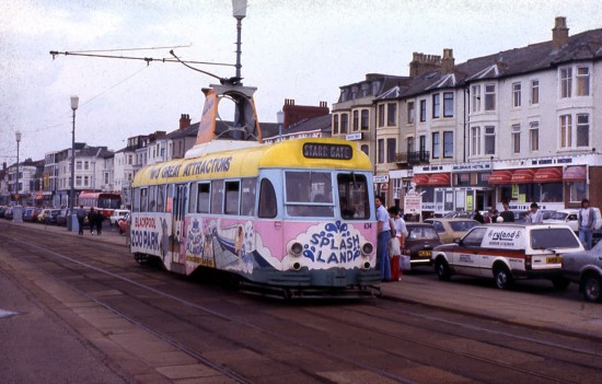 Today’s delve into the archives heads into the mid 1980s for another photo from Blackpool showing one of the many colourful all over adverts carried on the trams.