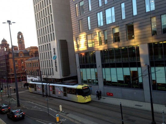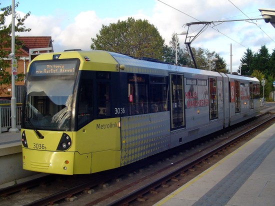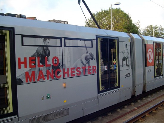 The vinyl revolution on Manchester Metrolink is showing no signs of slowing down with the latest tram to receive some being 3036. This is not a full vinyl wrap livery a la many of other all over adverts but has just received full window vinyls on the windows either side of the centre articulation with no changes to the bodyside fleet livery. With the slogan “Hello Manchester” it advertises Lululemon who apparently sell yoga clothes and running gear although the actual advert doesn’t tell you who the advertiser is with just the firms logo!