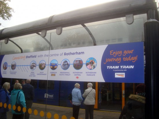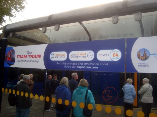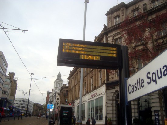 399 206 is towards the start of its journey to Rotherham Parkgate as it departs from Castle Square on 6th November.