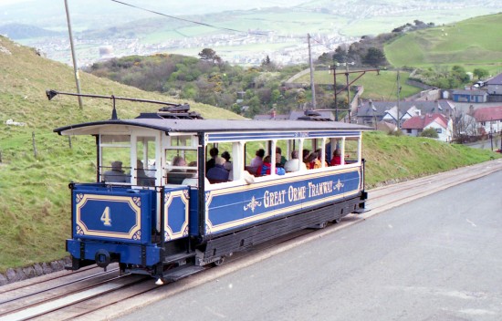 In this photo we see no. 4 descending the lower section of the tramway on 17th April 1993. Much in this image is as you will see if you visit the tramway today with the tram in same lined out blue and gold livery, carrying the St Tudno name and the trolleys are still on the tram although no longer used for any purpose. The trolleys had previously been used for communication purposes only but by 1993 the overhead had been removed with the poles used to hold this wire still in place as seen just above the front of the tram.
