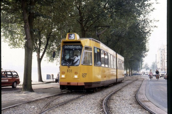 This photo is taken at Willinsplein and shows a tram working on route 5 to Schiebrook on 25th August 1990. The tram is no. 831 and is one of a batch of ZGT6’s built by Duewag in 1986, it was withdrawn from service in Rotterdam in 2009.