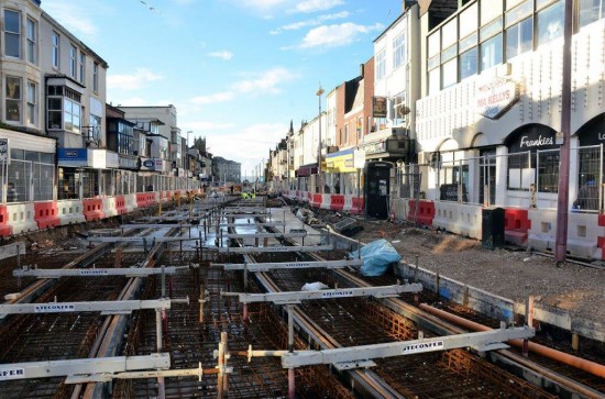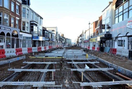 Construction work is continuing on the extension of the Blackpool Tramway along Talbot Road to Blackpool North Station with it increasingly looking like the Council’s “everything’s on target” statement being slightly misleading. Work on putting track in place along Talbot Road is ongoing and it has now been announced that work will get underway to connect the tracks to the current tramway at Talbot Square.