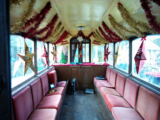 7 is ready for the off in this view. The tram has now received a genuine headlight which was found at this year’s Great Dorset Steam Fair. The Christmas decorations can also be seen including one of three trees on board.