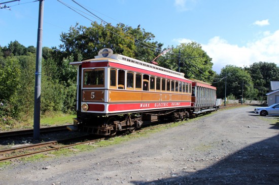 9 – the highest numbered of the remaining Tunnel Cars – is also the illuminated motor on the Manx Electric Railway. However, in this view it is still very much daylight so there is no need for its lights to be on – although they can be spotted in this photo – as it heads back to Derby Castle with trailer 40 for company on 5th September.