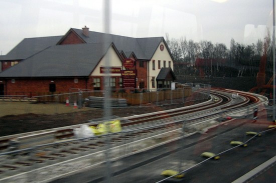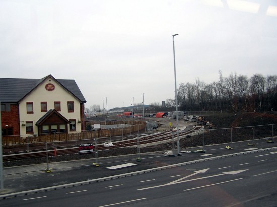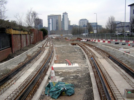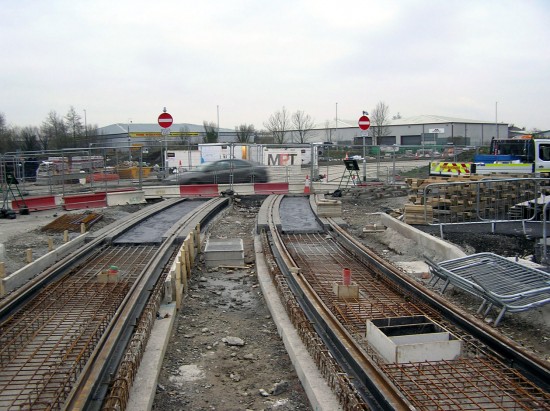 As the line goes from Trafford Wharf Road to Warren Bruce Road the track construction is in progress with the rails in place furthest from the camera.