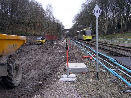 As 3025 is at the rear of a double unit with a Bury to Altrincham service we look south towards Manchester City Centre in this view including the new foot crossing which replaced the old bridge in early 2018. The new track and platform will arrive at the stop on the far left on this photo where the MPT compound is still in place.