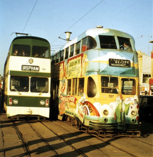 This photo was taken in either 1979 or 1980 and shows the relatively new Jubilee 761 alongside Balloon 707 on Blackpool Promenade. The Balloon Car is in an all over advert for The 3 Piers (that’s North, Central and South in case you weren’t aware) which was this tram’s second ever all over advert and unlike many adverts nowadays featured many bright colours publicising the attractions on each of the piers. 707 is probably heading to Pleasure Beach but a twisted blind means that Manchester (from Manchester Square) is also show in the destination aperture.