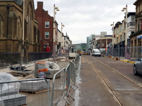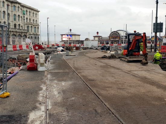 Work on the extension of the Blackpool Tramway along Talbot Road to Blackpool North Railway Station is continuing ahead of the delayed reopening of the Promenade road. As we have reported previously the Prom road was due to reopen during January after the completion of the connection of the old and new tracks but snagging works has meant this has been delay into February. Nevertheless good progress continues to be made on the extension – for all but the final approach to the new terminus where Wilkinson’s remains firmly in the way.