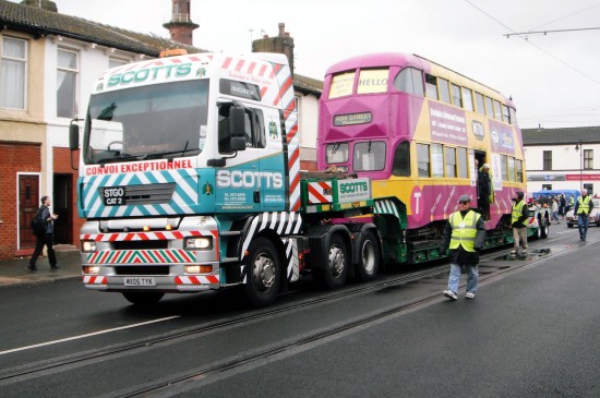 In this photo we see the tram on the back of the aforementioned low loader with special adverts applied publicising the then Friends of Fleetwood Trams (now Fleetwood Heritage Leisure Trust) plus the appropriate Ash Street Fleetwood destination.