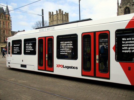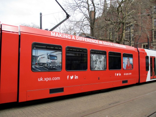 Stagecoach Supertram 116 has entered service in a new all over advert with XPO Logistics the sponsor of the tram. In a fairly simple design the tram is completed in white on each end section with the central section (plus part of each end) and the doors in red. There is also limited use of contravision of some central windows plus some simple transfers on other windows.