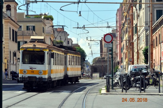 This time around we see 110 on the approach to Porta Maggiore. This unit is also one of the Stefer built vehicles used to operate the vast majority of services on the 3.4 mile line. The historic surroundings of Rome once again provide the backdrop for this image taken on 24th May 2018.