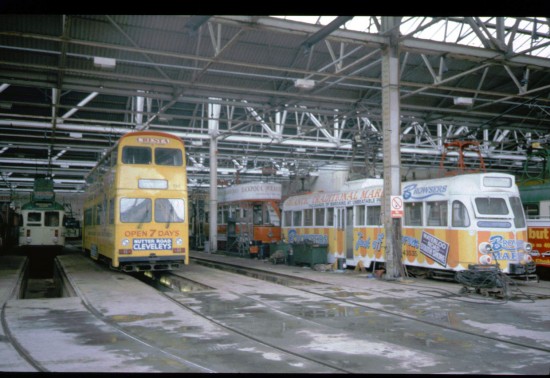 There are four trams easily recognisable in this shot but possibly of most interest is the tram seen on the far right hand side – Brush Railcoach 633. 1997 was to be the last year that this tram would run as a traditional Brush Car with it being withdrawn from service requiring an overhaul. But for 633 – which is seen here in an all over advert for Browsers Markets – this wouldn’t be to the same style as previous Brush overhauls (as seen on 631 the other side of the picture) as it would become the first new Illuminated Feature car since the 1960s! The tram was converted into the Trawler and would return to service in this style in time for the 2001 illuminations.