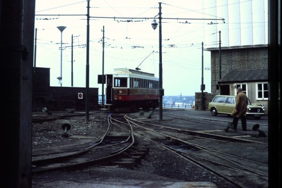 In this view the Derby Castle Shed foreman seems to be waiting for 5 although there doesn’t seem to be a driver on board. The Summerland complex is to the right.