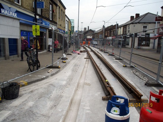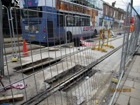 Taken through the windscreen of a tram the limit of tram operations on 22nd April is seen here with the worksite immediately ahead.