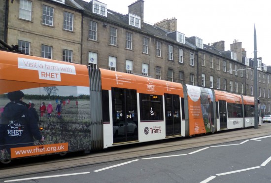 One side of the tram has the main advert for the Royal Highland Show (20th to 23rd June at the Royal Highland Centre) featuring a white base and an image of a stunning Highland Cattle and other views from previous shows. The other side uses much brighter colours – a nice orange background – and features publicity for the Royal Highland Education Trust. As with all other adverts in Edinburgh only the third and fifth sections of the tram have full height vinyls with the remainder of the tram being just above the windows.