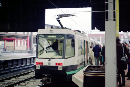 After much anticipation 6th April 1992 finally saw the start of a new era in light rail for the UK with services on Manchester Metrolink getting underway. Initially services were only able to run between Bury and Victoria – further sections would follow later in the year – and it is at the latter location that we see 1005. It has just terminated with a service from Bury and passengers wait on the platform ready to board to see what all the fuss has been about.