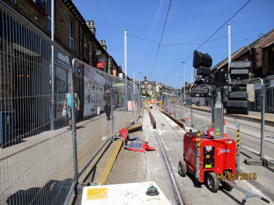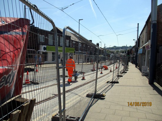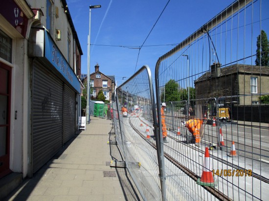 The first phase of the 2019 Stagecoach Supertram rail replacement project is still ongoing and progress has now moved along Middlewood Road to the junctions with Dykes Hall Road and Leader Road either side of the tramstop at Hillsborough Park. The worksite is on the outbound line and as usual the area being attended to is surrounded by fencing during the duration of the work. Stuart Cooke has been on the scene for us.