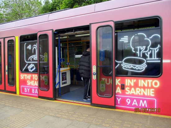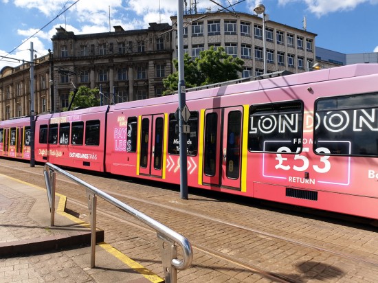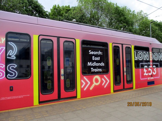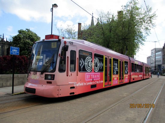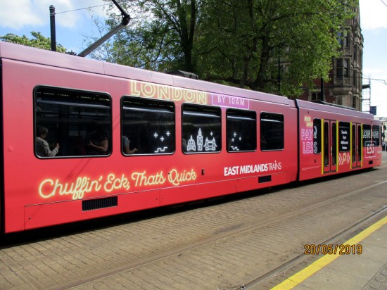 Stagecoach Supertram now has the most number of trams in all over adverts since opening in 1994 with 109 the fourth tram to receive vinyls. The advert applied is for East Midlands Trains – not the first tram to advertise the fellow Stagecoach company – with a reddish livery applied; just how long the tram carries this advert is debatable with Stagecoach losing the East Midlands franchise later this year. 109 was first seen in its new livery on 20th May.