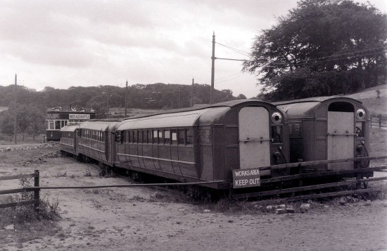 Taken on 4th August 1977 this view is in front of the tram depot with the Glasgow Subway Cars occupying the position which is now being redeveloped for a new bus depot to be constructed. These Subway Cars were being replaced at this time in a major refurbishment of the Clockwork Orange (with these dating from the Victorian era) and six were sent to Beamish to allow the museum to use their electrical equipment for on the trams being restored at the time. The vehicles were then broken up.