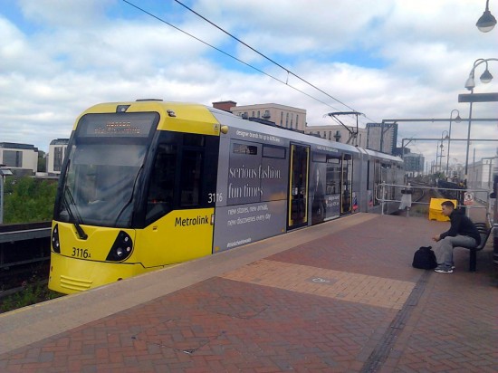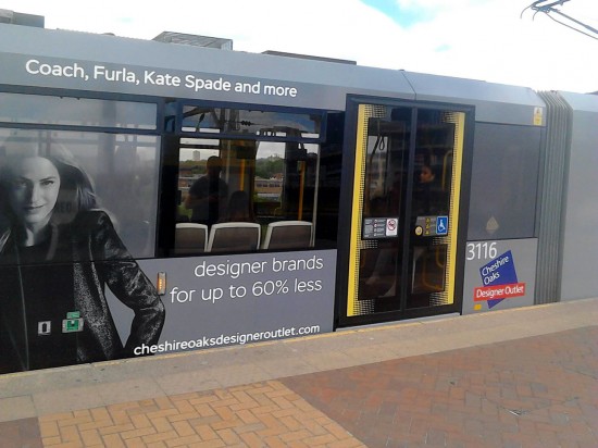 The latest vinyl wrap advert to be applied to a tram in Manchester is for the Cheshire Oaks Designer Outlet and is now featured on 3116. A grey design it does feature contravision on many of the windows although only when there are images on writing as part of the advert which does leave some random vinyl free windows! Reece Hughes has provided us with the following photos.