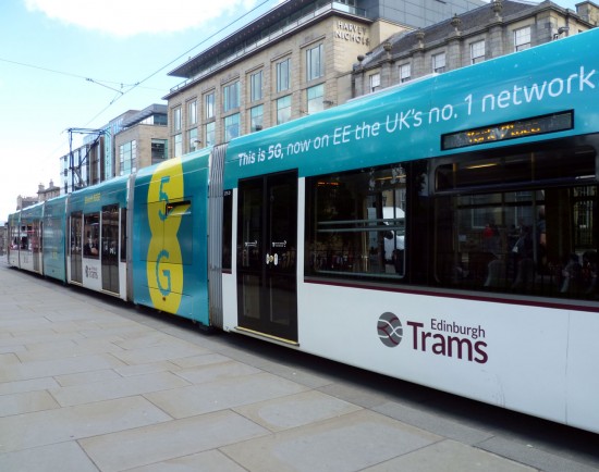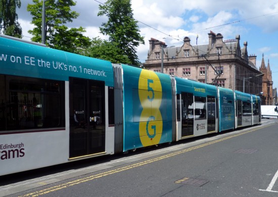 We’ve already shown you pictures of Edinburgh Trams 267 is in its latest advert for EE’s 5G network and now it’s a case of seeing double on the streets of the Scottish capital as 275 has received an identical advert! Once again featuring the EE house colours of turquoise and yellow the advert debuted during mid-June and replaces standard fleet livery on this tram which had lost its C R Smith advert during May.