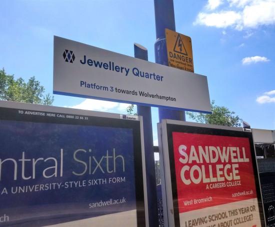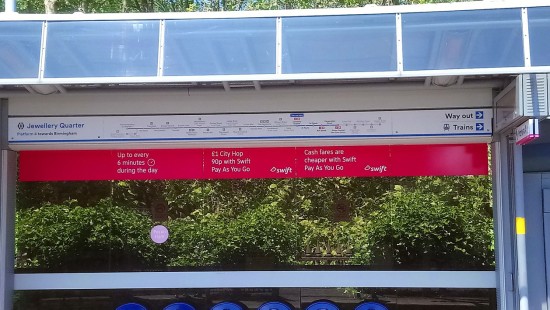 The new style map also at Jewellery Quarter. This includes the forthcoming Birmingham Westside extension (greyed out). Some of the old Network West Midlands branding is also still in place here including the pink banner under the map and also on the right the platform 4 sign. (All Photographs by Scott Murphy)