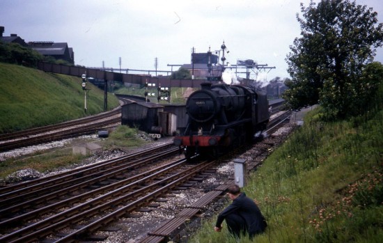 This photo was taken on 8th June 1964, some 35 years before trams would run in this location. It shows ex-LMS class 8F steam locomotive 48475 running towards Birmingham on the ex-GWR line from Wolverhampton. Of course the railway here is now abandoned and replaced by the West Midlands Metro which runs all the way to Wolverhampton St George’s including some street running. The railway line heading off on the left is the line to Stourbridge which remains an active railway today. The location of this image is The Hawthorns with the tram platforms behind the photographer.