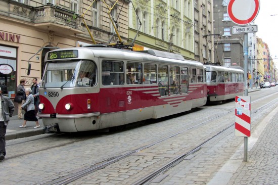 In this image we see Tatra T3R 8260 – plus another T3 – on route 26 at Strossmayerovo namesti on 14th May 2012. There are 24 T3R trams which are T3s rebuilt with a low floor centre section and are also painted in a distinctive dark red livery. The second tram seen here is a unrebuilt T3 (this class was built by Tatra between 1971 and 1980) which has also received the revised livery.