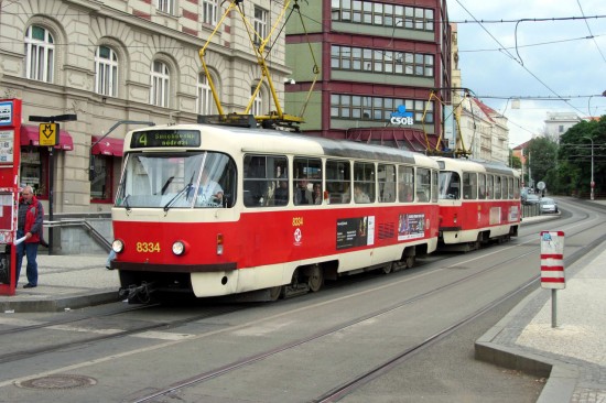 Another Tatra product is the feature of this image with one of the T3 trams – built between 1971 and 1980 – seen in the frame. This is 8334 – along with another unidentified tram – working on route 4 at Rasinovo Nabrezi on 14th May 2012.