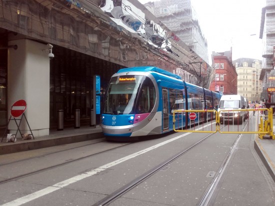 Just when you thought you had seen the last magenta tram actually running on the West Midlands Metro then 37 comes along with a replacement front wing – still in the old fleet livery! It is likely that 37 has bene one of a number of trams to be involved in RTCs recently which caused damage to its front wing which necessitated its replacement. As with all modern trams the construction of the panelling is such that when it does receive damage it can be just taken out and replaced with a spare and that is exactly what has happened in this case; although it would seem that as yet the re-vinyling hasn’t extended to these spares!