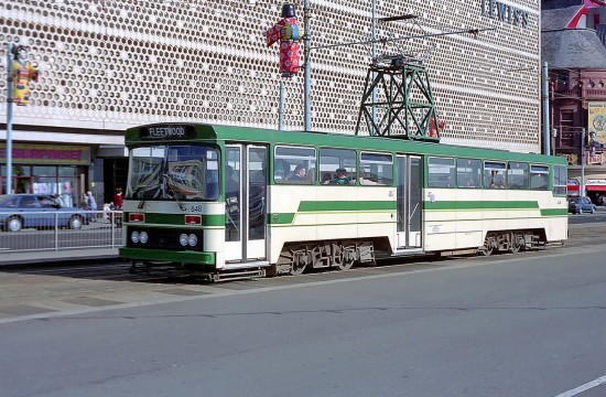 Centenary 648 was originally built as 651 which was a testbed for experimental GEC equipment but after these tests were concluded it was subsumed into the main Blackpool fleet and re-entered service as 648 in 1990 and it is that same year that we view the tram in the below image. The tram is just passing the old and highly recognisable Lewis’s building between Tower and North Pier and is working a service north to Fleetwood. The tram is in fleet livery as carried by all Centenary Cars when new.