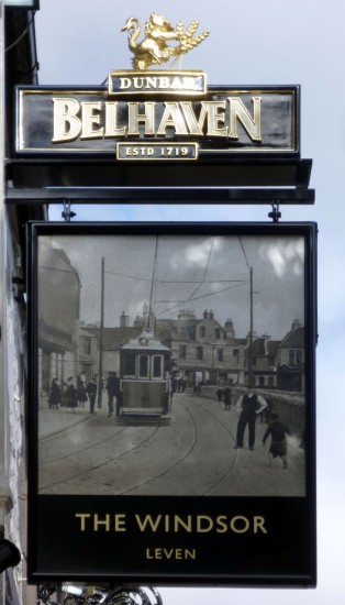 Pub signs around the UK often use steam locomotives as their main image but the use of trams is all together rarer (one notable exception being the Bispham Hotel up Red Bank Road which shows a Blackpool Balloon). Another pub which features a tram can be found in Leven, Fife, on the north shore of the Firth of Forth 34 miles from Edinburgh via the bridges. The Windsor is in High Street in the town and includes an image from an old postcard showing a tram in the town. Roy Calderwood recently paid a visit and provides us with more information.