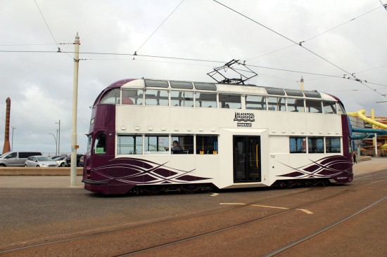 Now moving on to 2019 and 700 has been modernised with the widened centre entrances installed to allow it to operate at the light rail platforms, although its use for this purpose has been very much few and far between. It retains the twin destination screens and roof windows but the trolley is gone and replaced by a pantograph and the green and cream has been replaced by the Purple and White Flexity style livery. The tram is seen just entering Pleasure Beach loop.