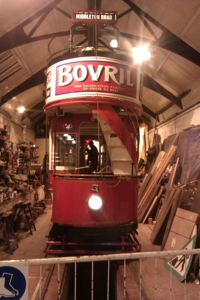 All dressed up but with nowhere to go - Stockport 5 inside the depot at Heaton Park on 10th March. Note the new 'Middleton Road' destination blinds fitted and the 'Bovril' advert banners. (Photo courtesey of the Heaton Park Tramway Facebook page)