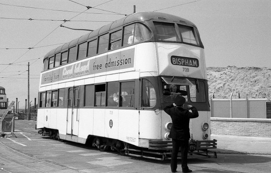 709 has remained in Blackpool throughout its history but was rebuilt to the flat front millennium condition and has also received the widened centre entrances. It remains at Rigby Road Depot, stored, still in an expired advert for the Sealife Centre.