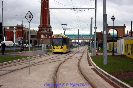 Here 3043 is leaving the Trafford Centre alongside Barton Dock Road and making is way to Cornbrook. (Both Photographs by Steve Hyde, 18th February 2020)