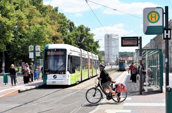Potsdam operates 18 five-section Stadler Variobahns with deliveries of the trams starting in 2010. Slightly longer than the examples running in Croydon (32.2m against 32m) but not as wide (2.3m against 2.65m) the trams have seating for 57 with space for a further 118 standees.
