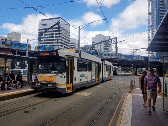 In this first photo we see B class tram 2087 at the Flinders Street/Spencer Street with a service on route 75 to Docklands. This nearly 23km route starts off from Vermonth South Shopping Centre and travels via Burwood, Camberwell, Hawthorn, Richmond and the city. It is also one of the routes which operates overnight on Saturday and Sunday mornings.