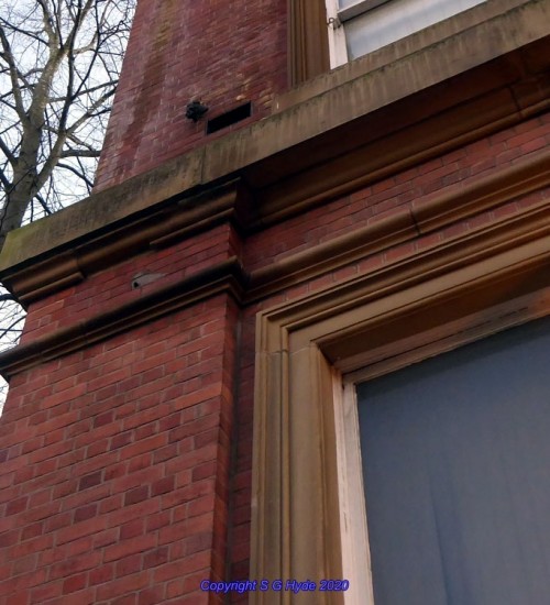 Just above the decorative ledge on this building we can see a old rosette still in place. It may look a little rusty but its original purpose can still be ascertained. The four holes below the decorative ledge would have had a rosette - probably a type 3 on its side.