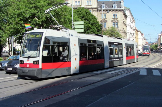 Low floor trams were first introduced to Vienna in 1995 when the Ultra Low Floor (ULF) trams entered service. We see one of the type A ULF cars here in no. 21 which is running on route 37 on Wahringer Strasse near Schottentor where trams run on two levels. The A type tram is a five section, 24.2m long vehicle and don’t have conventional bogies but the internally mounted motors each drive an individual wheel. This means that there is near level access from pavement stops with the height of the floor being just 197mm.