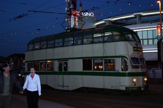 In this photo we can still easily make out the tram as being 703 in the 1980s Green and Cream livery as it stands at the southbound stop at Pleasure Beach bound for Starr Gate on 8th September 2006. The illuminations must have only just been switched on as there still remains some natural light in the sky and this photo would be perfectly acceptable if it wasn’t for the stray pedestrians who walk just in front of the standard view of the tram at an inopportune moment!