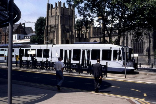 This image shows 12 at the Cathedral stop during 1995 with a service which appears to have terminated at the stop if the destination board in the lower windscreen is to be believed. February 1995 was when the line to Cathedral was opened with trams running for the first time from Fitzalan Square and then onto Shalesmoor. It is likely that this photo was taken at around that time. 12 remains new and clean and the tramstop is also pristine having been barely used at this time.