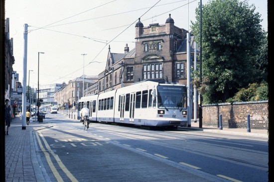 Taken on 17th August 1995 we are looking at one of the original Siemens-Duewag built trams with a service bound for Herdings Park. Taken on the westerly end of Glossop Road the destination blinds had obviously not been fully installed by this time as the tram is carrying the destination as a separate card at the bottom of the driver’s windscreen. By this date the complete original system was running except for the section between Shalesmoor and Malin Bridge/Middlewood.