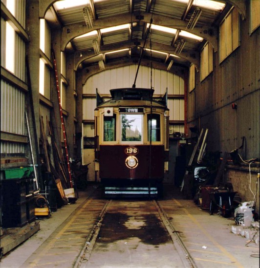 This photo shows 196 on 16th August 1996 inside the depot. The tram was carrying the fictious “Beamish Tramways” legend on the side at this time having been painted in an approximation of the Gateshead livery. Of course, it has since received a repaint into the attractive South Shields Blue and Primrose livery style.