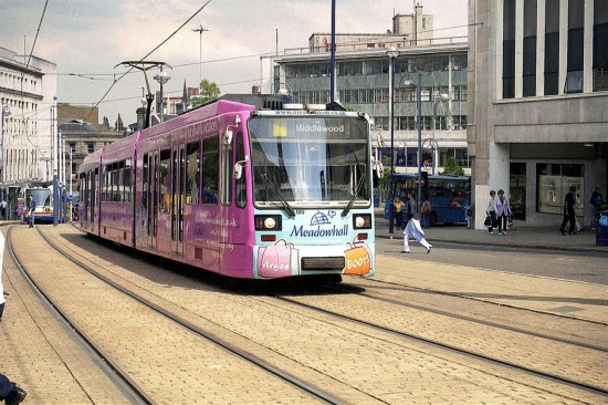 Over the years a number of trams have carried advertising liveries with one of those being shown here on 120. Advertising the Meadowhall Shopping Centre – the terminus of the Yellow route and previously the Purple route at times – by the time of this photo being taken in 2002 the system was being operated by Stagecoach and was commercially known as Stagecoach Supertram. 120 retains the roller blinds and it is operating a Yellow route service to Middlewood as it climbs up towards Cathedral from Castle Square.