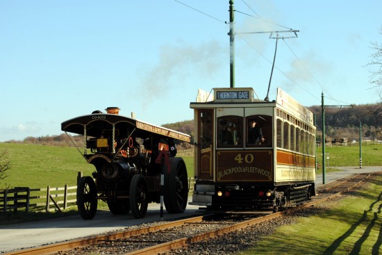 At a time when social distancing was not a term we used in everyday life Burrell Showman Road Locomotive 3896 “Earl Beatty” is seen close alongside the tram as they both head towards the town. The steam powered locomotive was built in 1921 and is a regular performer at Beamish special events.
