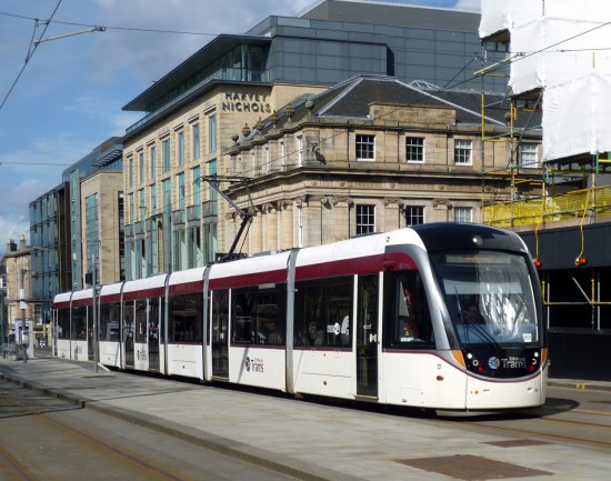 The first stop after the current terminus at York Place in Edinburgh City Centre is that at St Andrew Square which features an island platform with road traffic passing in both directions. It is also the stop suggested to access Edinburgh Waverley Railway Station although does feature an uphill walk when arriving in the city.