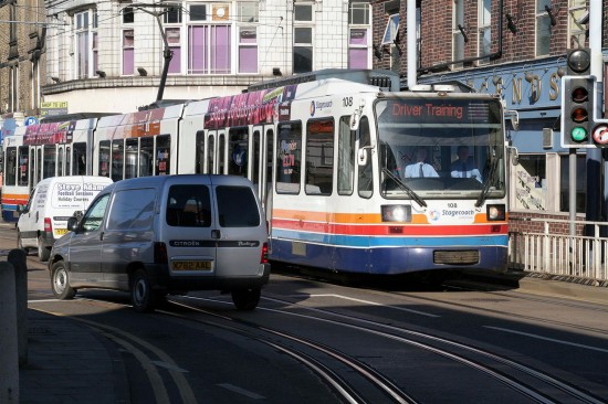 This time around we see 108 – originally numbered 08 – at Hillsborough as it is used for Driver Training as seen by the electronic destination display. At this time the tram was in the mainly white Stagecoach livery with orange, red and blue stripes plus a dark blue skirt. As we’ve already mentioned this tram had received the destination display modification with the old roller blinds replaced by an electronic display.