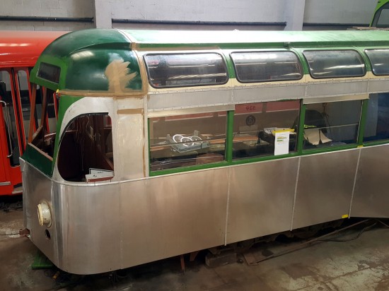 The exterior is now fully repanelled with the new panels clearly identified as the few remaining sections not required repanelling remain in the old 1980s Green and Cream livery that the tram carried when last in service as 679. The difference in the tram now that it has all its panels in place is good to see and it does really start to increase the excitement of a time when the tram may return to service on Blackpool Promenade once more.