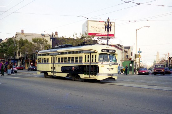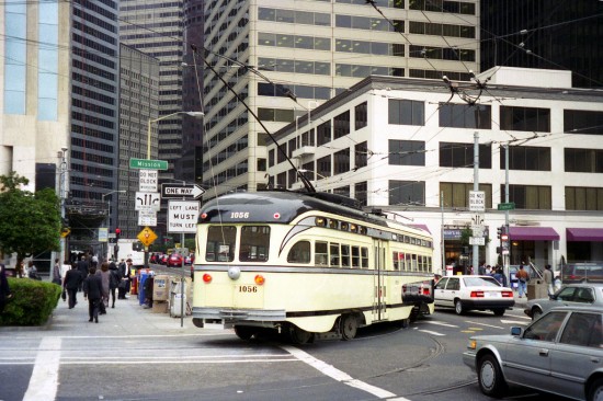 Today’s “Around the World in Trams” again features a PCC in service in San Francisco, with this one running in a “tribute” livery to Kansas.